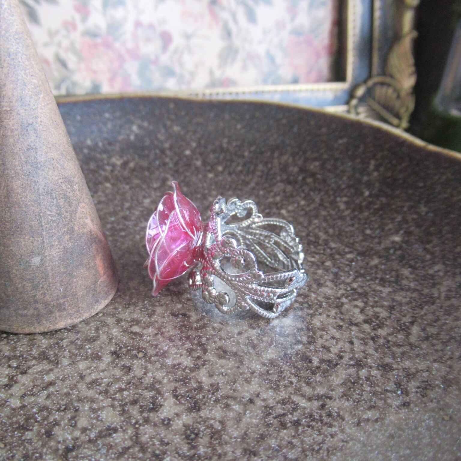 透明感のある赤色の薔薇、アンティーク風の指輪です。