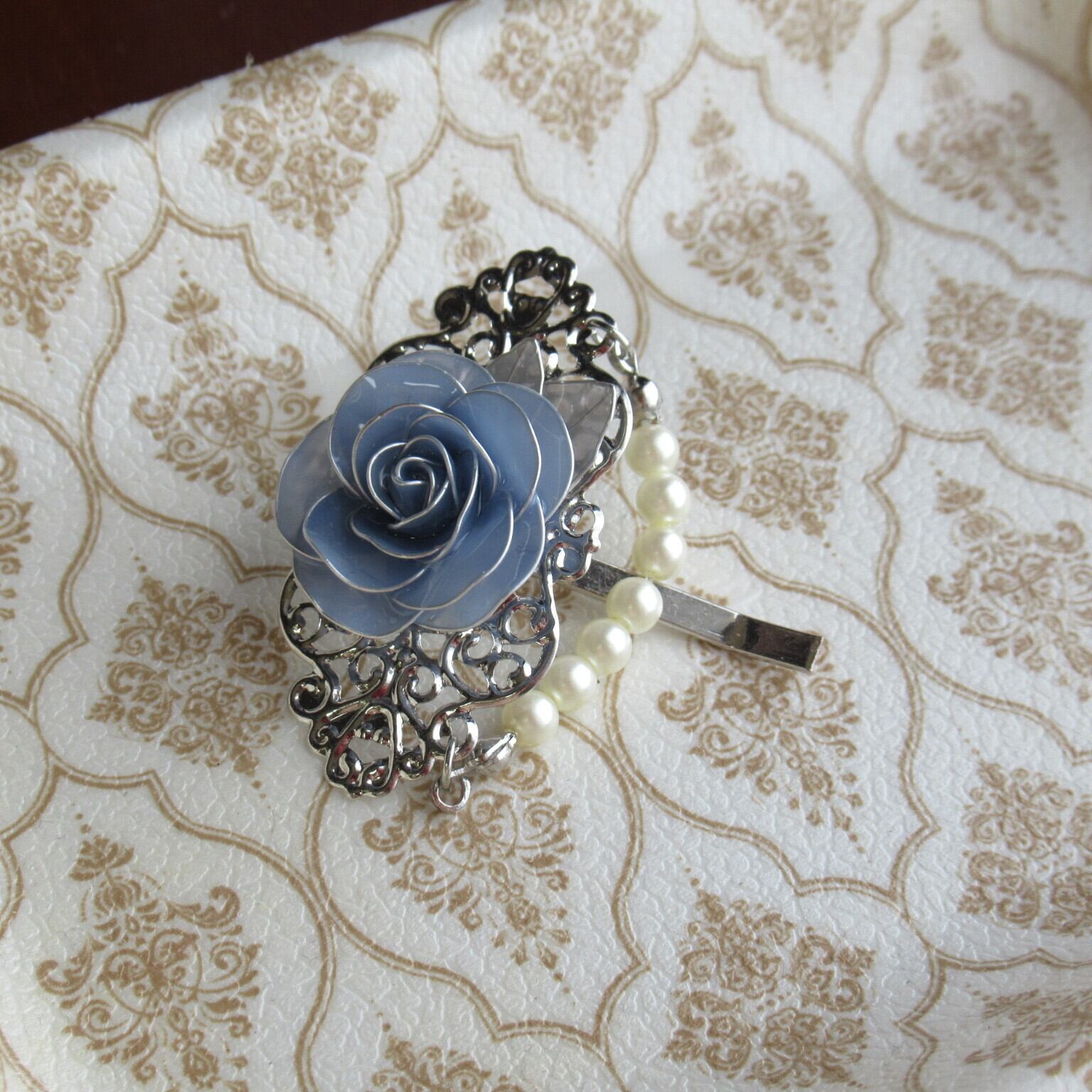 淡い優しい色合いの青の薔薇をモチーフにした、アンティーク風のポニーフックです。