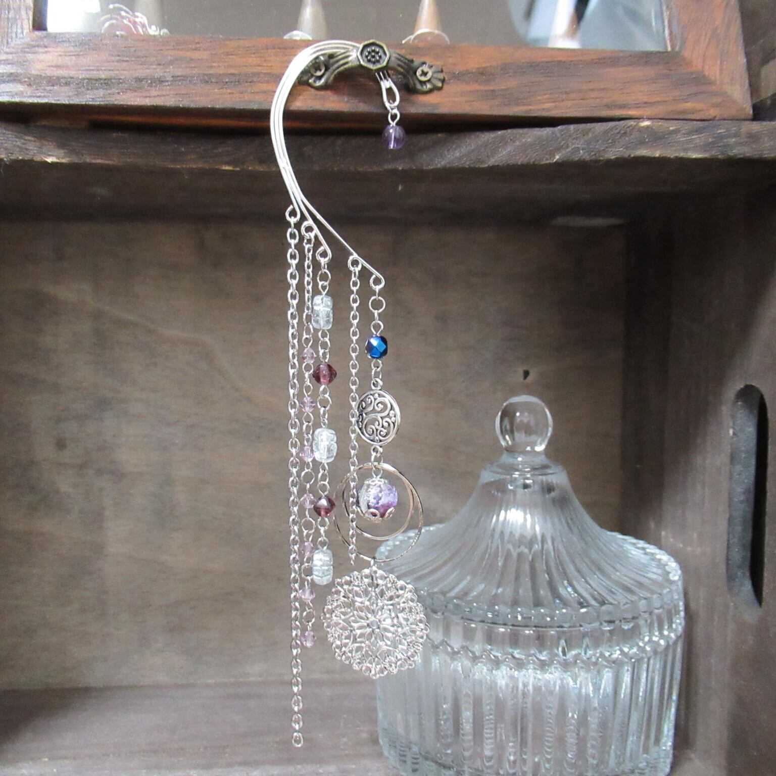 幻想的なホタルガラスが光に反射し、マリンパープルの美しい色合いが耳元を彩ります。このデザインは、特別な日やカジュアルなコーディネートにもぴったりのアイテムです。